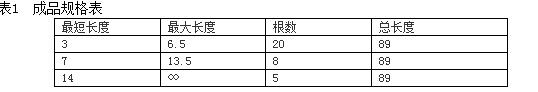 原料按長(zhǎng)度分檔,通常以0.5米為一檔,如:3-3.4米按3米計(jì)算,3.5米-3.9米按3.5米計(jì)算,其余的依此類推。表1是幾種常 見(jiàn)成品的規(guī)格,長(zhǎng)度單位為米,∞表示沒(méi)有上限,但實(shí)際長(zhǎng)度小于26米。
